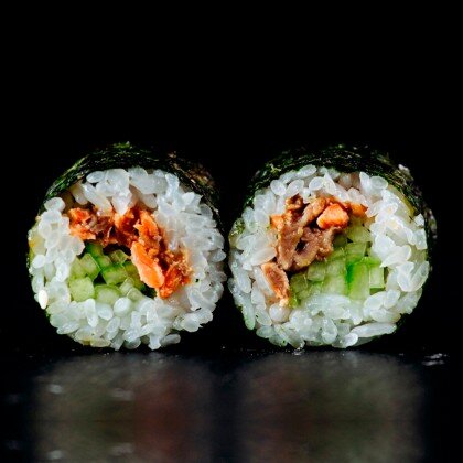 Рис, нори, огурец, лосось охлажденный, икра «Тобико», сыр творожный