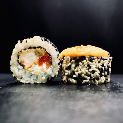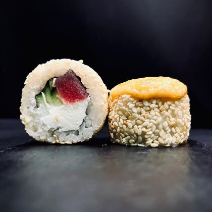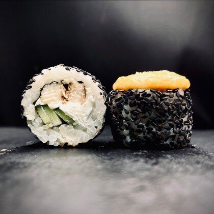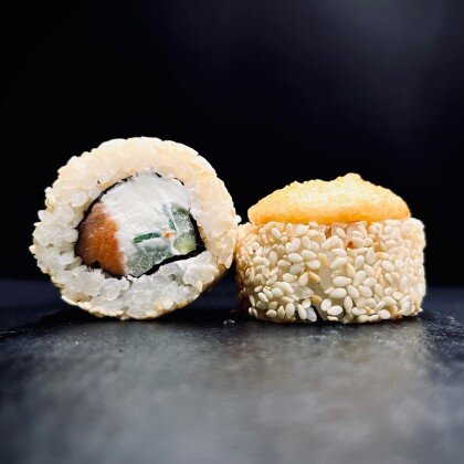 Нори, рис, лосось «Терияки», огурец, творожный сыр, запеченная сырная шапочка, икра «Тобико» 220 гр (8шт)