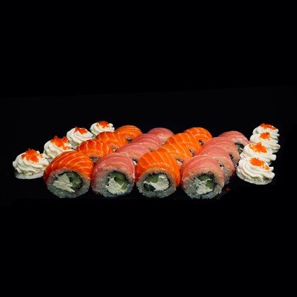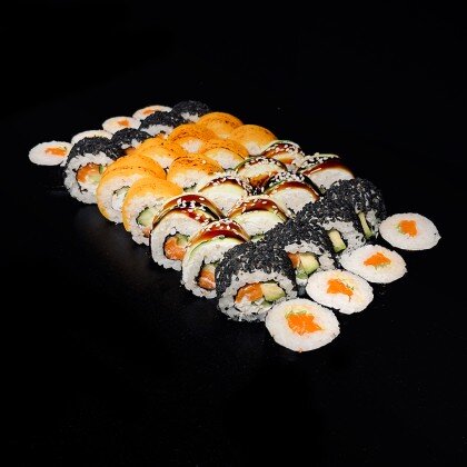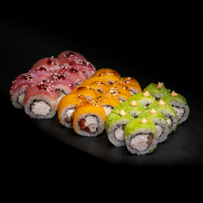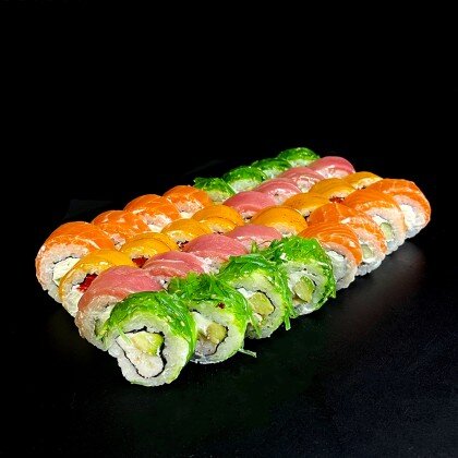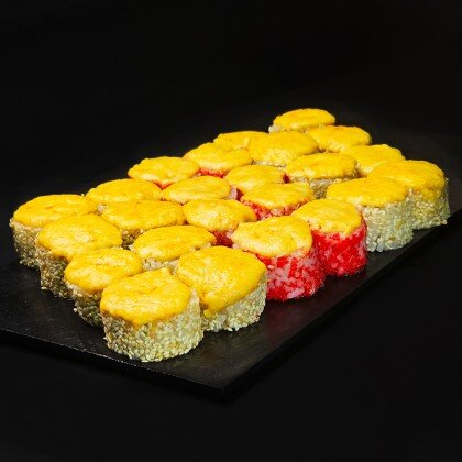 Ролл «Чеддер Чикен» (нори,рис, сыр творожный,сыр твердый «Чеддер», курица копченая,перец сладкий,соус «Кисло-сладкий»)