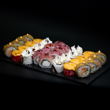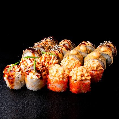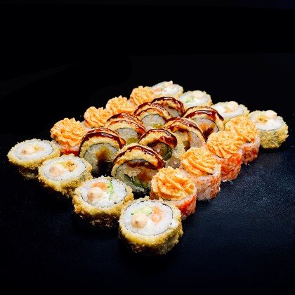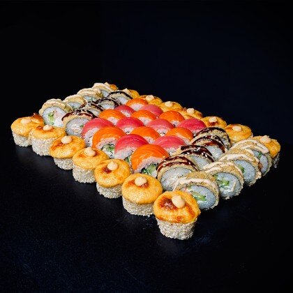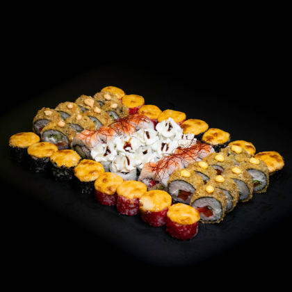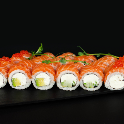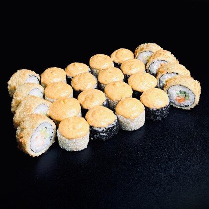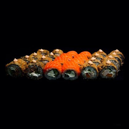 Темпура ролл «Сяке фурай маки» (нори,рис, сыр творожный,лосось охлажденный, огурец,соус «Спайси»)