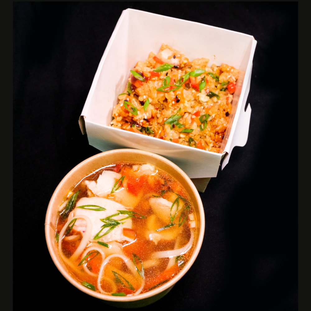 Бульон с курицей и лапшой + жареный рис с овощами и курицей.